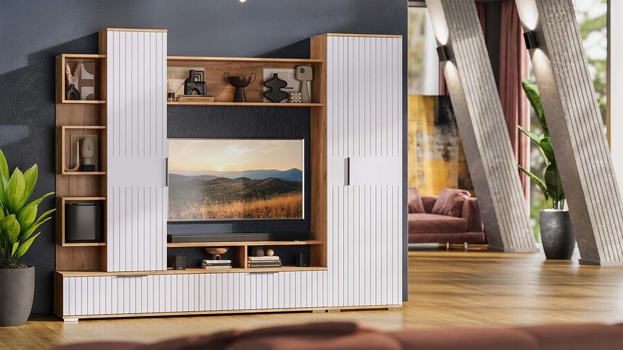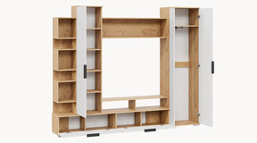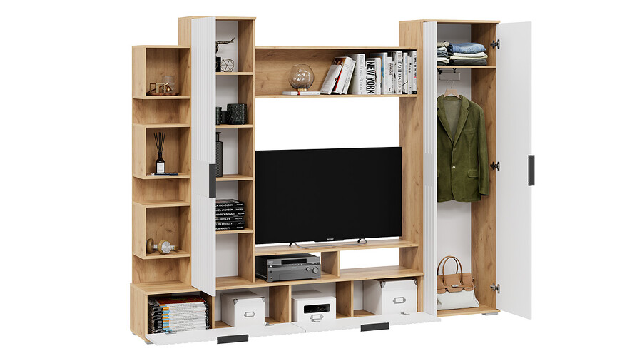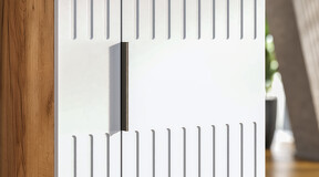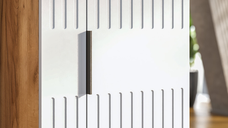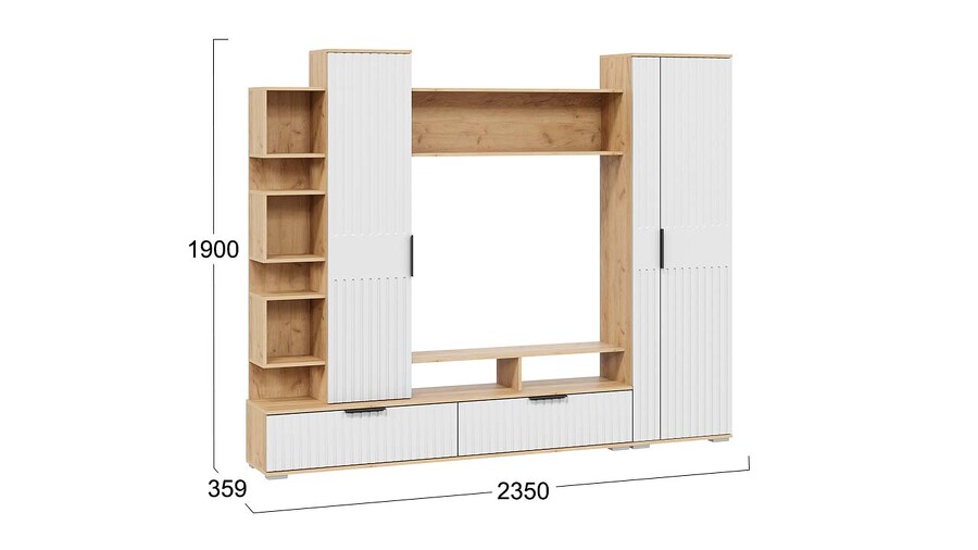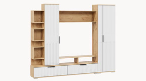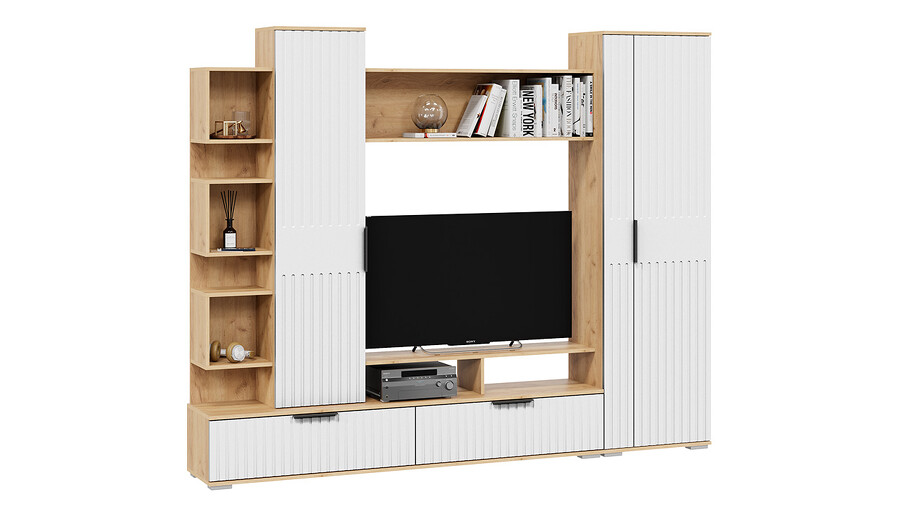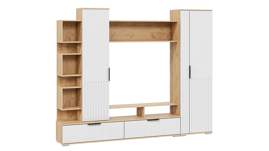 Наполнить пространство легкостью, энергией, атмосферой чистоты и комфортом поможет гостиная «Моника». Декор. Важной особенностью новинки являются фасады с рельефной фрезеровкой, которые создают особый эффект света и теней, наполняют интерьер динамикой и движением, придают необычный облик повседневным предметам. Дизайн фасадов с вертикальными линиями меняет восприятие пространства — визуально раздвигает границы, добавляет воздушности. Цвет торцевых металлических ручек гармонично сочетается с фасадами, создавая современный и элегантный облик гостиной. Функциональность. Четкость линий и геометричность форм дополнены функциональностью и надежностью конструкции. Композиция представляет собой полностью продуманный готовый комплект для воплощения неповторимой гостиной. Стенка оснащена удобными открытыми полками и ящиками, которые обеспечивают легкий доступ к необходимым предметам. Комбинация секций для книг, телевизора, декора, позволяет создать завершенный вид интерьера. Двухдверный шкаф с выдвижной штангой предоставляет удобный доступ к одежде. | Каркас: ЛДСП 16мм Фасад: МДФ 19мм, пленка ПВХ
