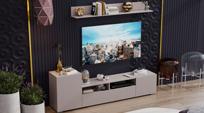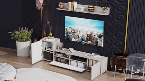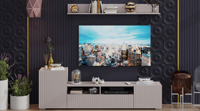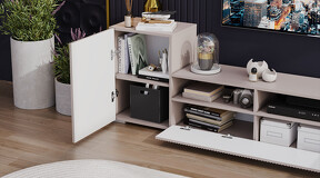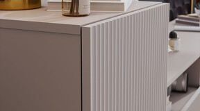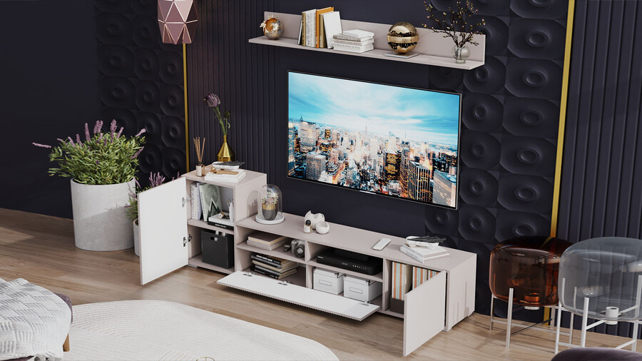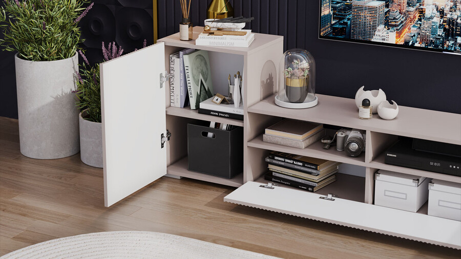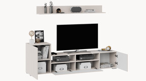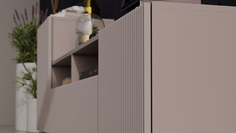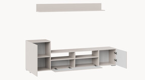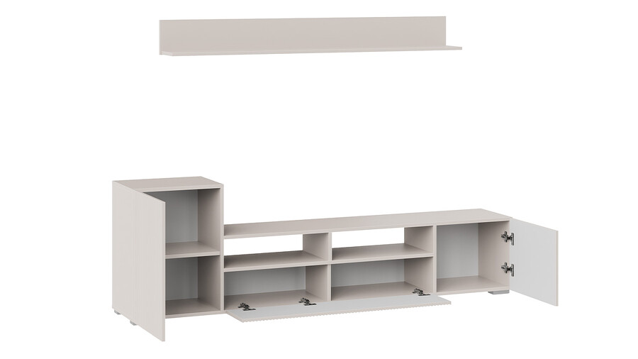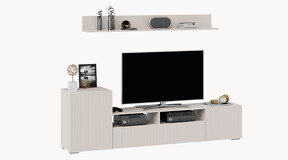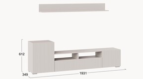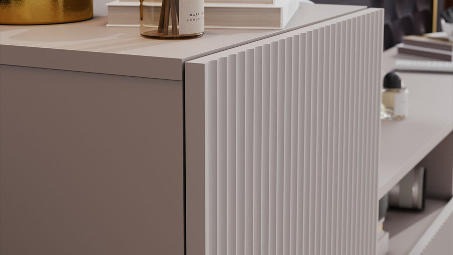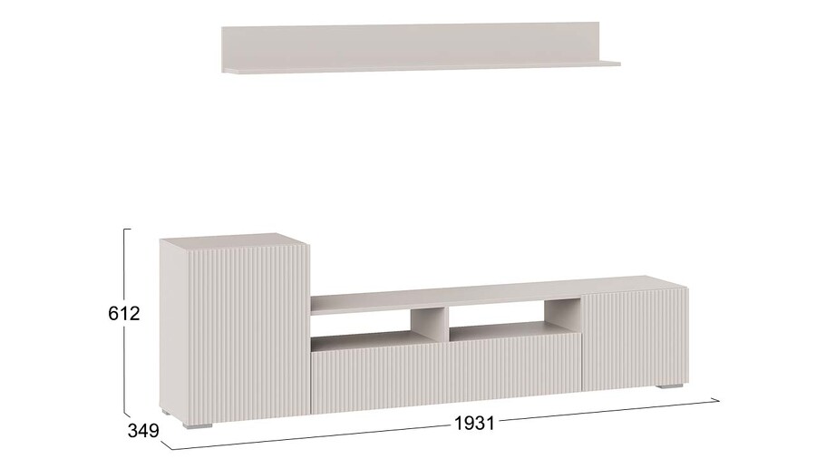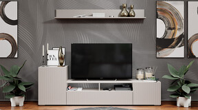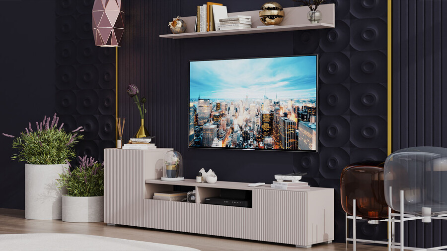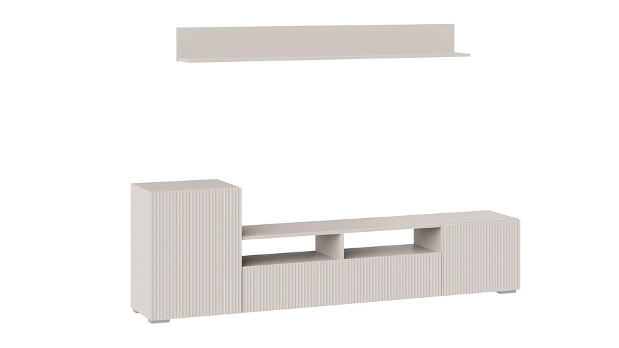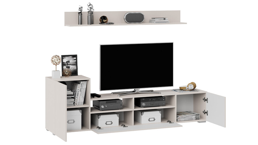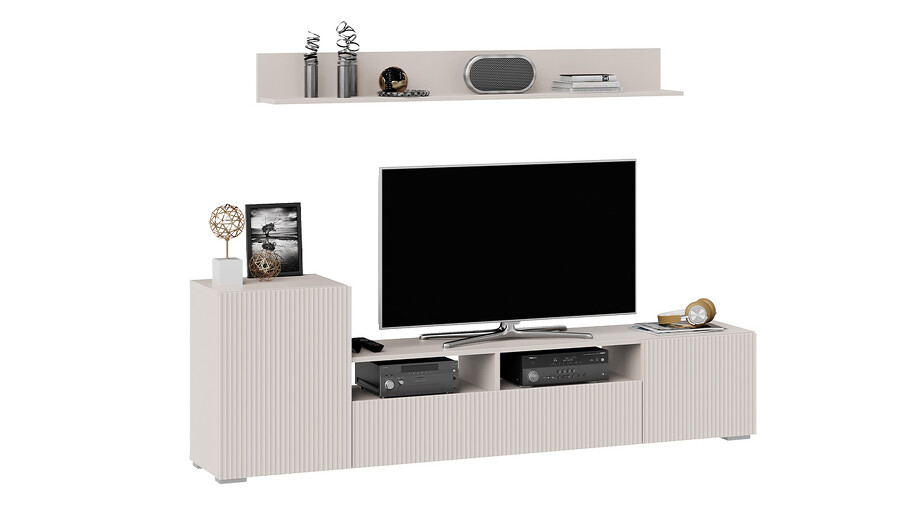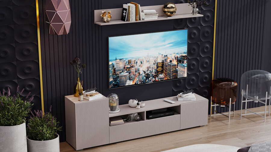 Дизайн. Гостиная представлена в трендовых декорах, что позволяет гармонично вписать его в любой интерьер, будь то классический или современный. Важной особенностью новинки является вертикальная фрезеровка на фасадах, которая дополняет стильный образ. Отличительной чертой тумбы является отсутствие лицевой фурнитуры, благодаря чему модель выглядит лаконично. За привлекательными распашными фасадами расположены вместительные ниши, что позволяет разместить необходимые предметы и аппаратуру.