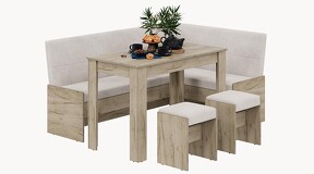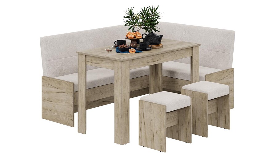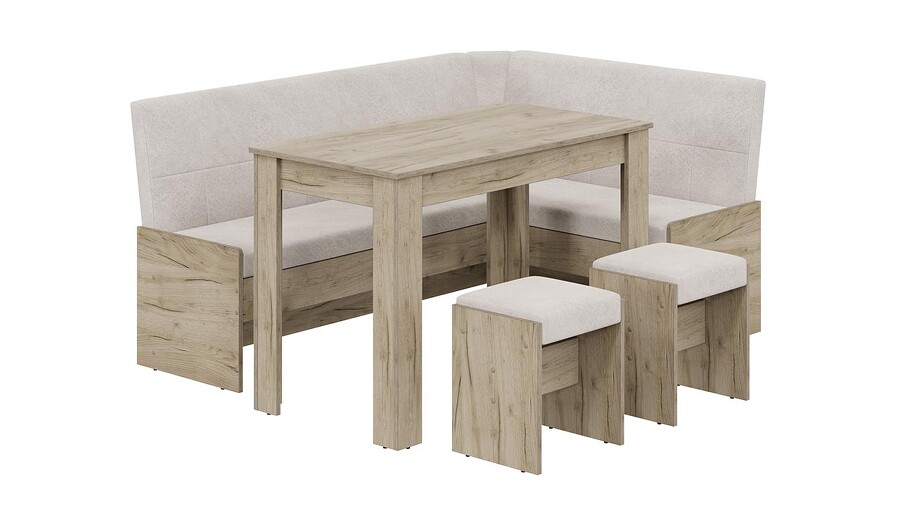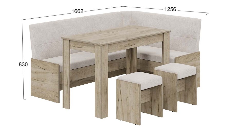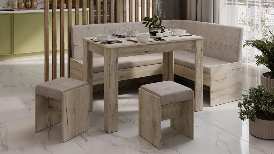 Кухонный уголок «Пекин» - практичная и эргономичная модель уголка, которая поможет расположить большое число посадочных мест на ограниченном пространстве. Она отлично впишется в любой интерьер, создаст ощущение уюта и максимального комфорта. Мягкий обивочный материал с лаконичной отстрочкой в форме квадратов придает изделию эстетичный, стильный внешний вид. Материалы. Каркас изделия изготовлен из ЛДСП 16 мм с обработкой торцов кромкой ПВХ. Для мягкости спинки и сиденья применяется практичный наполнитель ППУ, который имеет высокий уровень влагообмена и воздухопроницаемости. Обивка скамьи и банкеток представлена в актуальной ткани – микровелюр Duna, это бархатистая мягкая ткань, материал нового поколения с более коротким ворсом в сравнении с традиционным велюром, ненавязчивый универсальный принт коллекции напоминает о россыпях песка, каждая крупинка которого – словно драгоценность, ждущая своего открытия. Тест Мартиндейла: > 100 000 циклов. Современное цветовое оформление. Кухонный уголок «Пекин» — комплект, где удачно подобраны по дизайну и габаритам скамья и стол с набором одинаковых банкеток. Все элементы идеально сочетаются по цвету, фактуре, создавая единую композицию и ощущение комфорта и уюта. Модель представлена в разнообразных актуальных декорах, а значит, с их помощью Вы можете подобрать идеально подходящий цветовой вариант и создать неповторимый интерьер. Функциональность. Угловой комплект мебели помогает оптимально использовать пространство. Сборка скамьи в этом наборе возможна как на левую, так и на правую сторону. Поэтому уголок «Пекин» станет хорошим вариантом для приобретения, ведь расположить его с легкостью можно будет в любой планировке. | Декор: