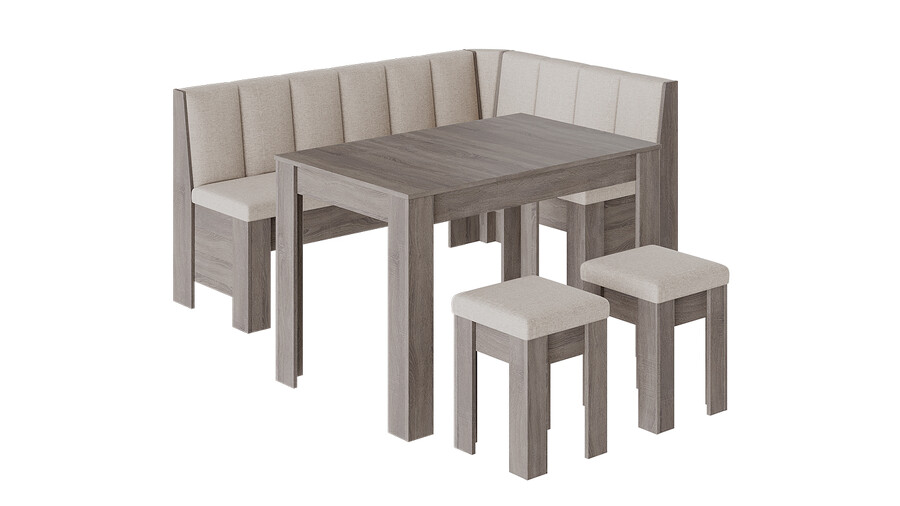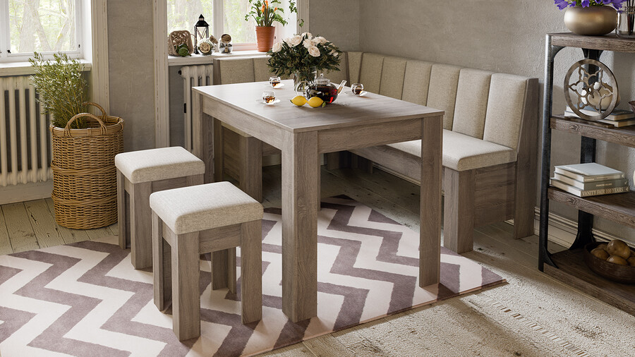 Кухонный уголок «Ганновер» - выгодное решение для домашнего интерьера, которое помогает расположить большое число посадочных мест на ограниченном пространстве. Это компактный набор мебели, разработанный с учетом современных тенденций. За счет удобства и уюта он станет главной частью кухни, где захочется проводить больше времени. Материалы. Каркас изделия изготовлен из ЛДСП 16 мм с обработкой торцов кромкой ПВХ. Для мягкости спинки и сиденья применяется практичный наполнитель ППУ, который имеет высокий уровень влагообмена и воздухопроницаемости. Материал Capri, используемый в изготовлении уголка — универсальная рогожка, состоящая из мелкофактурного переплетения однотонных и меланжевых нитей. Тест Мартиндейла: 30 000. Современное цветовое оформление и дизайн. Кухонный уголок «Ганновер» — комплект, где удачно подобраны по дизайну и габаритам скамья и стол с набором одинаковых банкеток. Каркас изделия выполнен в декоре «Дуб сонома трюфель» - один из самых популярных вариантов отделки мебели в современном интерьере. Данный оттенок привносит теплоту и элегантность в помещение. Обивка мягких элементов выполнена в светло-бежевом оттенке, благодаря чему придает изделию стильный внешний вид. Все элементы идеально сочетаются по цвету, фактуре, создавая единую композицию и ощущение комфорта и уюта. Функциональность. Угловой комплект мебели помогает оптимально использовать пространство. Сборка скамьи в этом наборе возможна как на левую, так и на правую сторону. Поэтому уголок «Ганновер» станет хорошим вариантом для приобретения, ведь расположить его с легкостью можно будет в любой планировке. В конструкции уголка под сиденьями есть место для хранения. | Декор: