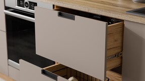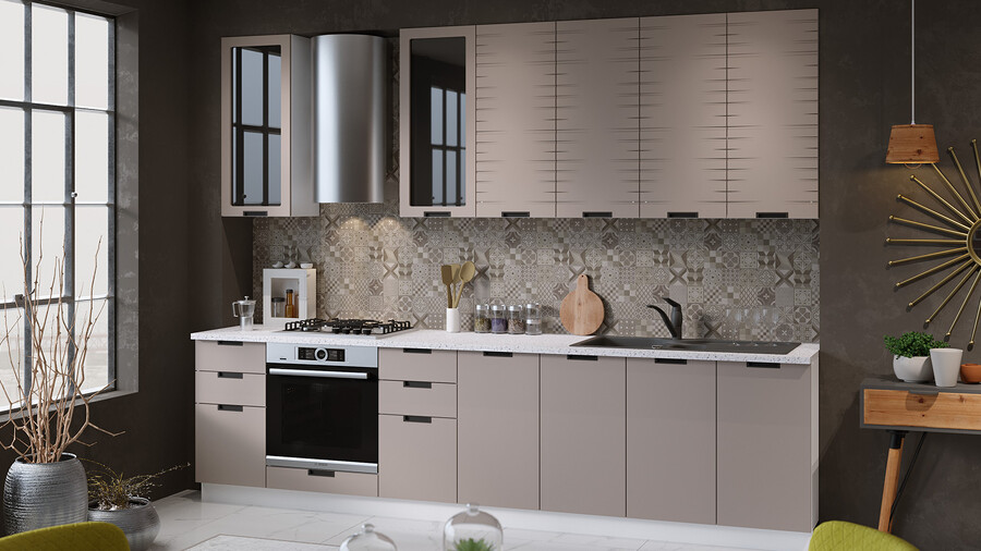 «Гренада» - кухня, имеющая свой неповторимый характер, которую хочется рассматривать и любоваться ее необычным исполнением. Она создана для поклонников современного дизайна благодаря технологичной врезной ручке и трендовой ПВХ-пленке. Гармонично подобранные сочетания текстурных оттенков создают широчайшую палитру идеальных вариаций и акцентов на Вашей кухне. Матовые плёночные фасады. Фасады выполнены из МДФ 16 мм в матовой пленке ПВХ с уникальным тиснением «холст». Декоративная пленка призвана придать яркую индивидуальность, эксклюзивность и узнаваемость. Модель привлекает внимание благородными декорами «Холст белый», «Холст вулкан», «Холст латте», «Холст мокко». Широкая гамма вариантов исполнения фасадов позволяет приобрести мебель на любой вкус и под разный интерьер кухни. Декоры выделяются сдержанной красотой и элегантностью, спокойные цвета не перегружают взгляд. Изысканный дизайн элементов серии. Кухня «Гренада» сочетает в себе фасады без фрезеровки и с фрезеровкой. Горизонтальная фрезеровка на фасадах напоминает мираж в пустыне. Благодаря разной глубине фрезеровки: глубокой по краям створки и уходящей в ноль к середине, фасад приобретает эффект 3Д-рисунка. В оформлении используются вставки из черного непрозрачного глянцевого стекла лакобель 4 мм. Интегрированная пластиковая ручка черного цвета удобна в использовании и, благодаря своей форме, делает дизайн контрастным, необычным и привлекающим внимание. Уменьшенная глубина каркасов. Каркасы в декоре «Белый» и «Дуб крафт золотой» выполнены из ЛДСП 16 мм. Новинка подойдет даже для малогабаритных кухонь, ведь глубина нижних каркасов 478 мм. Пластиковые ножки выглядят стильно и имеют регуляцию по высоте. Модульность. Коллекция содержит в себе широкий ряд элементов для основных нужд хозяек: верхние модули с глухими распашными фасадами, распашными фасадами со стеклом, нижние модули распашные, комбинированные, с ящиками под бытовую технику. Все это многообразие позволяет комплектовать гарнитур только из необходимых элементов исходя из индивидуальных потребностей. Дополнительные опции. Для завершения композиции и повышения уровня комфорта при эксплуатации дополнительно приобретаются: столешница, пластиковый цоколь, плинтус пристенный, стыковочные, угловые и торцевые планки для столешниц и стеновых панелей, посудосушители, которыми можно оснастить верхние модули, петли с доводчиками, для замены петель стандартной комплектации. | Каркас: ЛДСП 16 мм с кромкой ПВХ