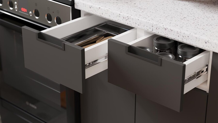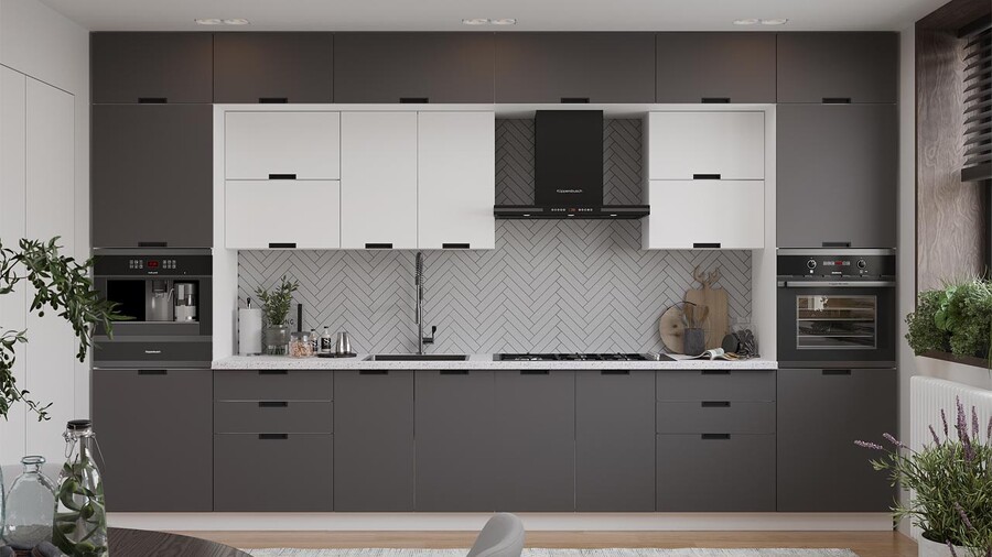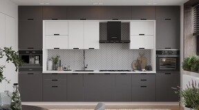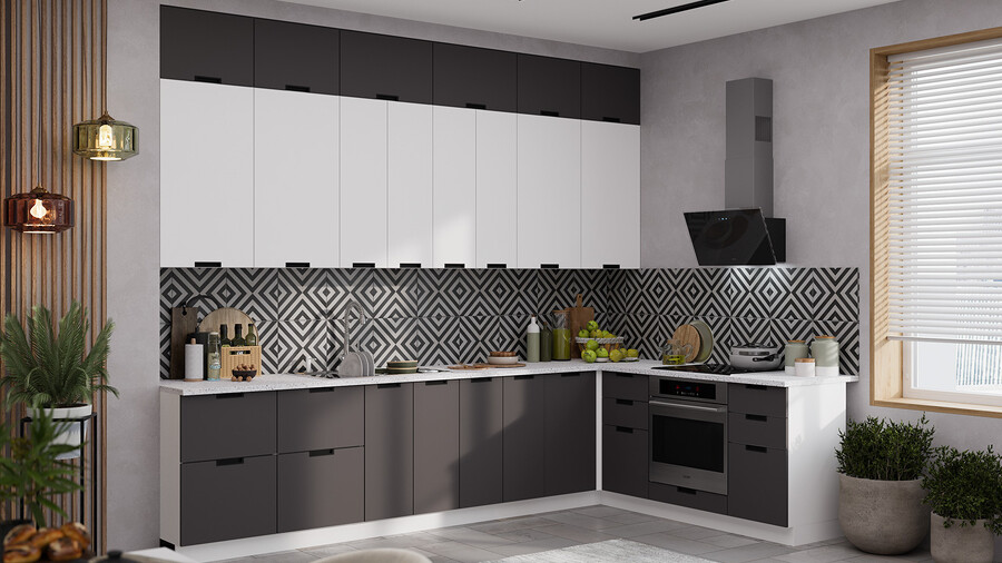 «Гренада» - кухня, имеющая свой неповторимый характер, которую хочется рассматривать и любоваться ее необычным исполнением. Она создана для поклонников современного дизайна благодаря технологичной врезной ручке и трендовой ПВХ-пленке. Гармонично подобранные сочетания текстурных оттенков создают широчайшую палитру идеальных вариаций и акцентов на Вашей кухне. Матовые плёночные фасады. Фасады выполнены из МДФ 16 мм в матовой пленке ПВХ с уникальным тиснением «холст». Декоративная пленка призвана придать яркую индивидуальность, эксклюзивность и узнаваемость. Модель привлекает внимание благородными декорами «Холст белый», «Холст вулкан», «Холст латте», «Холст мокко». Широкая гамма вариантов исполнения фасадов позволяет приобрести мебель на любой вкус и под разный интерьер кухни. Декоры выделяются сдержанной красотой и элегантностью, спокойные цвета не перегружают взгляд. Изысканный дизайн элементов серии. Кухня «Гренада» сочетает в себе фасады без фрезеровки и с фрезеровкой. Горизонтальная фрезеровка на фасадах напоминает мираж в пустыне. Благодаря разной глубине фрезеровки: глубокой по краям створки и уходящей в ноль к середине, фасад приобретает эффект 3Д-рисунка. В оформлении используются вставки из черного непрозрачного глянцевого стекла лакобель 4 мм. Интегрированная пластиковая ручка черного цвета удобна в использовании и, благодаря своей форме, делает дизайн контрастным, необычным и привлекающим внимание. Уменьшенная глубина каркасов. Каркасы в декоре «Белый» и «Дуб крафт золотой» выполнены из ЛДСП 16 мм. Новинка подойдет даже для малогабаритных кухонь, ведь глубина нижних каркасов 478 мм. Пластиковые ножки выглядят стильно и имеют регуляцию по высоте. Модульность. Коллекция содержит в себе широкий ряд элементов для основных нужд хозяек: верхние модули с глухими распашными фасадами, распашными фасадами со стеклом, нижние модули распашные, комбинированные, с ящиками под бытовую технику. Все это многообразие позволяет комплектовать гарнитур только из необходимых элементов исходя из индивидуальных потребностей. Дополнительные опции. Для завершения композиции и повышения уровня комфорта при эксплуатации дополнительно приобретаются: столешница, пластиковый цоколь, плинтус пристенный, стыковочные, угловые и торцевые планки для столешниц и стеновых панелей, посудосушители, которыми можно оснастить верхние модули, петли с доводчиками, для замены петель стандартной комплектации. | Каркас: ЛДСП 16 мм с кромкой ПВХ