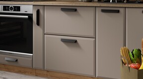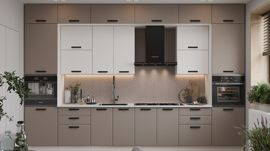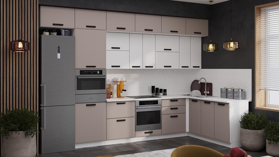 Кухня «Тиана» создана для тех, кто следует самым актуальным трендам интерьерной моды. Ее отличительной особенностью являются матовые фасады в выразительных оттенках и графичность их исполнения в сочетании с безупречно подобранной ручкой. Эта кухня понравится тем, кто живет в современном ритме, но мечтает создать в доме пространство, наполненное уютом и гармонией. Матовые плёночные фасады. Фасады выполнены из МДФ 19 мм в матовой пленке ПВХ с лаконичной фрезеровкой по периметру. Это придает кухне утонченный образ и делает ее узнаваемой. Изысканный дизайн элементов серии. Модель привлекает внимание благородными декорами «Белый супермат», «Асфальт супермат», «Мокко супермат». Натуральные оттенки остаются актуальными и в современном пространстве. Пластиковая ручка черного цвета удобна в использовании и, благодаря своей оригинальной форме, полностью завершает композицию. Уменьшенная глубина каркасов. Каркасы в декоре «Белый» и «Дуб крафт золотой» выполнены из ЛДСП 16 мм. Новинка подойдет даже для малогабаритных кухонь, ведь глубина нижних каркасов 478 мм. Пластиковые ножки выглядят стильно и имеют регуляцию по высоте. Модульность. Коллекция содержит в себе широкий ряд элементов для основных нужд хозяек: верхние модули с глухими распашными фасадами, нижние модули распашные, комбинированные, с ящиками под бытовую технику. Все это многообразие позволяет комплектовать гарнитур только из необходимых элементов исходя из индивидуальных потребностей. Дополнительные опции. Для завершения композиции и повышения уровня комфорта при эксплуатации дополнительно приобретаются: столешница, пластиковый цоколь, плинтус пристенный, стыковочные, угловые и торцевые планки для столешниц и стеновых панелей, посудосушители, которыми можно оснастить верхние модули, петли с доводчиками, для замены петель стандартной комплектации. | Каркас: ЛДСП 16 мм с кромкой ПВХ