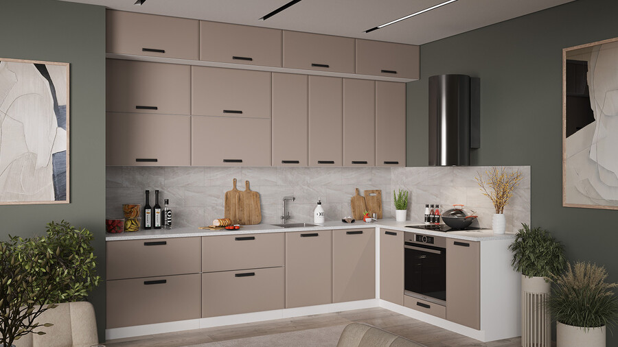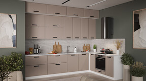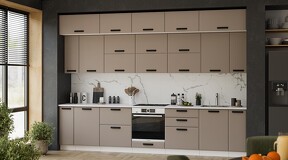 Кухня «Тиана» создана для тех, кто следует самым актуальным трендам интерьерной моды. Ее отличительной особенностью являются матовые фасады в выразительных оттенках и графичность их исполнения в сочетании с безупречно подобранной ручкой. Эта кухня понравится тем, кто живет в современном ритме, но мечтает создать в доме пространство, наполненное уютом и гармонией. Матовые плёночные фасады. Фасады выполнены из МДФ 19 мм в матовой пленке ПВХ с лаконичной фрезеровкой по периметру. Это придает кухне утонченный образ и делает ее узнаваемой. Изысканный дизайн элементов серии. Модель привлекает внимание благородными декорами «Белый супермат», «Асфальт супермат», «Мокко супермат». Натуральные оттенки остаются актуальными и в современном пространстве. Пластиковая ручка черного цвета удобна в использовании и, благодаря своей оригинальной форме, полностью завершает композицию. Уменьшенная глубина каркасов. Каркасы в декоре «Белый» и «Дуб крафт золотой» выполнены из ЛДСП 16 мм. Новинка подойдет даже для малогабаритных кухонь, ведь глубина нижних каркасов 478 мм. Пластиковые ножки выглядят стильно и имеют регуляцию по высоте. Модульность. Коллекция содержит в себе широкий ряд элементов для основных нужд хозяек: верхние модули с глухими распашными фасадами, нижние модули распашные, комбинированные, с ящиками под бытовую технику. Все это многообразие позволяет комплектовать гарнитур только из необходимых элементов исходя из индивидуальных потребностей. Дополнительные опции. Для завершения композиции и повышения уровня комфорта при эксплуатации дополнительно приобретаются: столешница, пластиковый цоколь, плинтус пристенный, стыковочные, угловые и торцевые планки для столешниц и стеновых панелей, посудосушители, которыми можно оснастить верхние модули, петли с доводчиками, для замены петель стандартной комплектации. | Каркас: ЛДСП 16 мм с кромкой ПВХ