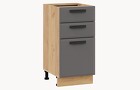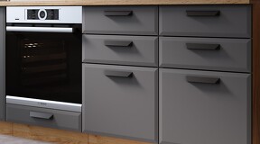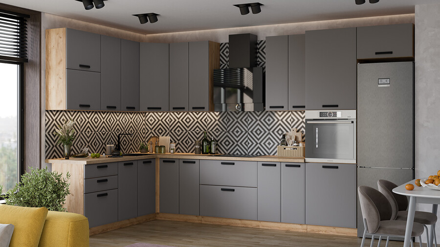 Кухня «Тиана» создана для тех, кто следует самым актуальным трендам интерьерной моды. Ее отличительной особенностью являются матовые фасады в выразительных оттенках и графичность их исполнения в сочетании с безупречно подобранной ручкой. Эта кухня понравится тем, кто живет в современном ритме, но мечтает создать в доме пространство, наполненное уютом и гармонией. Матовые плёночные фасады. Фасады выполнены из МДФ 19 мм в матовой пленке ПВХ с лаконичной фрезеровкой по периметру. Это придает кухне утонченный образ и делает ее узнаваемой. Изысканный дизайн элементов серии. Модель привлекает внимание благородными декорами «Белый супермат», «Асфальт супермат», «Мокко супермат». Натуральные оттенки остаются актуальными и в современном пространстве. Пластиковая ручка черного цвета удобна в использовании и, благодаря своей оригинальной форме, полностью завершает композицию. Уменьшенная глубина каркасов. Каркасы в декоре «Белый» и «Дуб крафт золотой» выполнены из ЛДСП 16 мм. Новинка подойдет даже для малогабаритных кухонь, ведь глубина нижних каркасов 478 мм. Пластиковые ножки выглядят стильно и имеют регуляцию по высоте. Модульность. Коллекция содержит в себе широкий ряд элементов для основных нужд хозяек: верхние модули с глухими распашными фасадами, нижние модули распашные, комбинированные, с ящиками под бытовую технику. Все это многообразие позволяет комплектовать гарнитур только из необходимых элементов исходя из индивидуальных потребностей. Дополнительные опции. Для завершения композиции и повышения уровня комфорта при эксплуатации дополнительно приобретаются: столешница, пластиковый цоколь, плинтус пристенный, стыковочные, угловые и торцевые планки для столешниц и стеновых панелей, посудосушители, которыми можно оснастить верхние модули, петли с доводчиками, для замены петель стандартной комплектации. | Каркас: ЛДСП 16 мм с кромкой ПВХ