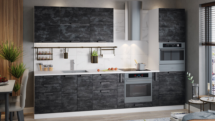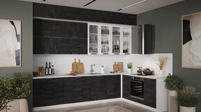 Модульная кухня «Детройт» отличается лаконичным дизайном, при этом комплект выглядит эффектно и оригинально, благодаря продуманному подбору декоров. Цветовые исполнения этой кухни будут прекрасно сочетаться с любыми оттенками в оформлении интерьера и идеально подойдёт как для маленьких, так и для просторных помещений. Декоративное покрытие. Фасады «Белый глянец» выполнены из МДФ 16 мм, в плёнке ПВХ, а фасады ЛДСП 16 мм в современных декорах «Дуб крафт золотой» и «Угольный камень». Эти декоры призваны придать особый шик, эксклюзивность и узнаваемость. Уникальная текстура «Угольный камень» достоверно имитирует природный материал. Актуальный декор «Дуб крафт золотой» придаёт кухне выразительный внешний вид. На фасадах «Белый глянец» также присутствуют вставки из тонированного стекла. Изысканный дизайн элементов серии. Пластиковая, матово-гладкая чёрная ручка, «мягкая на ощупь», имеет оригинальную фрезеровку. Она удобна в использовании, подчёркивает стиль Лофт и полностью завершает композицию. Уменьшенная глубина каркасов. Каркасы в декоре «Белый» и «Дуб крафт золотой» выполнены из ЛДСП 16 мм. Новинка подойдёт даже для малогабаритных кухонь, ведь глубина нижних каркасов 478 мм. Пластиковые ножки выглядят стильно и имеют регуляцию по высоте. Можно дополнительно приобрести и установить белый пластиковый цоколь. Модульность. Коллекция содержит в себе широкий ряд элементов для основных нужд хозяек: верхние модули с глухими распашными фасадами, нижние модули распашные, комбинированные, с ящиками под бытовую технику. Все это многообразие позволяет комплектовать гарнитур только из необходимых элементов исходя из индивидуальных потребностей. Дополнительные опции. Для завершения композиции и повышения уровня комфорта при эксплуатации дополнительно приобретаются: столешница, пластиковый цоколь, плинтус пристенный, стыковочные, угловые и торцевые планки для столешниц и стеновых панелей, посудосушители, которыми можно оснастить верхние модули, петли с доводчиками, для замены петель стандартной комплектации. | Каркас: ЛДСП 16 мм с кромкой ПВХ