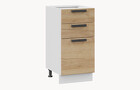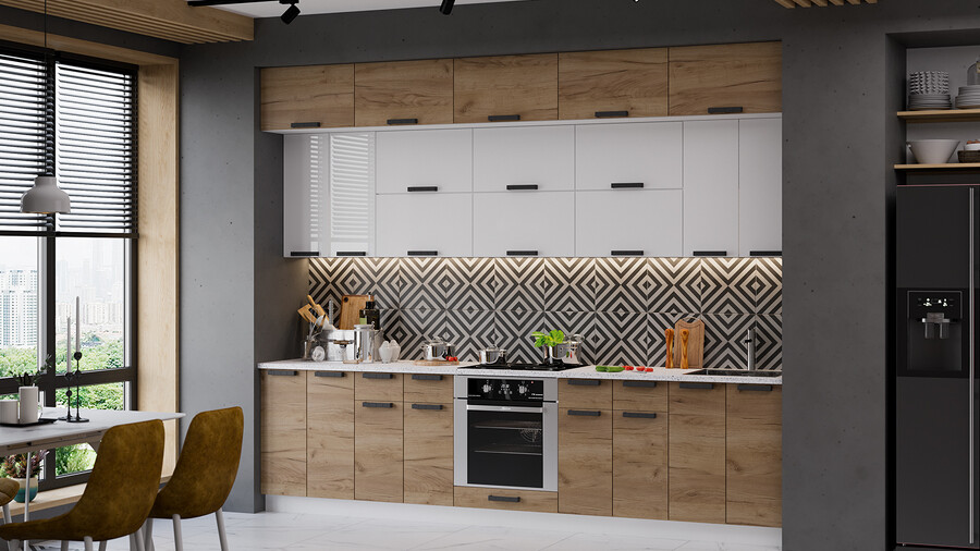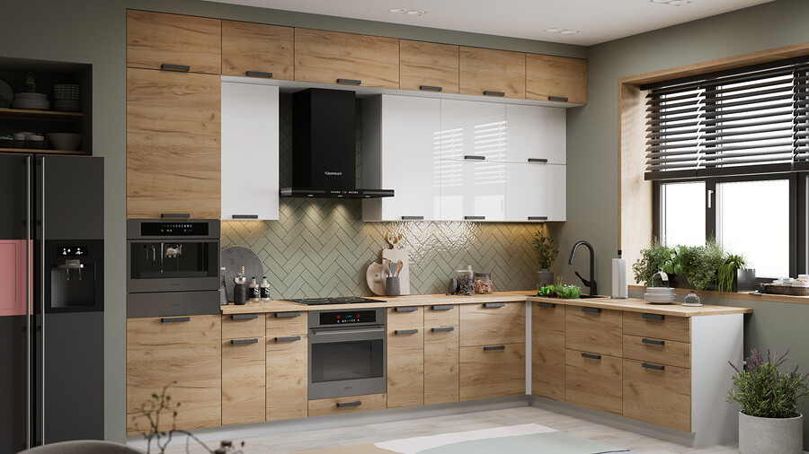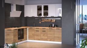 Модульная кухня «Детройт» отличается лаконичным дизайном, при этом комплект выглядит эффектно и оригинально, благодаря продуманному подбору декоров. Цветовые исполнения этой кухни будут прекрасно сочетаться с любыми оттенками в оформлении интерьера и идеально подойдёт как для маленьких, так и для просторных помещений. Декоративное покрытие. Фасады «Белый глянец» выполнены из МДФ 16 мм, в плёнке ПВХ, а фасады ЛДСП 16 мм в современных декорах «Дуб крафт золотой» и «Угольный камень». Эти декоры призваны придать особый шик, эксклюзивность и узнаваемость. Уникальная текстура «Угольный камень» достоверно имитирует природный материал. Актуальный декор «Дуб крафт золотой» придаёт кухне выразительный внешний вид. На фасадах «Белый глянец» также присутствуют вставки из тонированного стекла. Изысканный дизайн элементов серии. Пластиковая, матово-гладкая чёрная ручка, «мягкая на ощупь», имеет оригинальную фрезеровку. Она удобна в использовании, подчёркивает стиль Лофт и полностью завершает композицию. Уменьшенная глубина каркасов. Каркасы в декоре «Белый» и «Дуб крафт золотой» выполнены из ЛДСП 16 мм. Новинка подойдёт даже для малогабаритных кухонь, ведь глубина нижних каркасов 478 мм. Пластиковые ножки выглядят стильно и имеют регуляцию по высоте. Можно дополнительно приобрести и установить белый пластиковый цоколь. Модульность. Коллекция содержит в себе широкий ряд элементов для основных нужд хозяек: верхние модули с глухими распашными фасадами, распашными фасадами со стеклом, нижние модули распашные, комбинированные, с ящиками под бытовую технику. Все это многообразие позволяет комплектовать гарнитур только из необходимых элементов исходя из индивидуальных потребностей. Дополнительные опции. Для завершения композиции и повышения уровня комфорта при эксплуатации дополнительно приобретаются: столешница, пластиковый цоколь, плинтус пристенный, стыковочные, угловые и торцевые планки для столешниц и стеновых панелей, посудосушители, которыми можно оснастить верхние модули, петли с доводчиками, для замены петель стандартной комплектации. | Каркас: ЛДСП 16 мм с кромкой ПВХ
