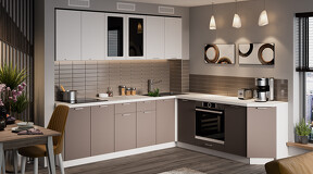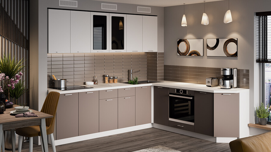 Кухня «Габриэлла» прекрасно сочетает в себе строгость форм и простоту линий. Это выбор людей, живущих в ногу со временем, которые ценят стиль и высокую эффективность. Цветовые исполнения этой кухни будут прекрасно сочетаться с любыми оттенками в оформлении интерьера и идеально подойдёт как для маленьких, так и для просторных помещений. Кухня «Габриэлла» создана для поклонников современного дизайна, это прекрасный выбор для тех, кто хочет придать своей кухне яркую индивидуальность. Матовые плёночные фасады. Имеют благородный внешний вид и приятны на ощупь. Фасады выполнены из МДФ 16 мм в матовой плёнке ПВХ, создающей ровную гладкую поверхность с фрезеровкой по периметру под прямым углом. Изысканный дизайн элементов серии. Особый шик и узнаваемость кухне придают актуальные благородные декоры «Сноу», «Крем», «Муссон», «Титан» и вставки из чёрного непрозрачного глянцевого стекла лакобель 4 мм. Пластиковая, металлического цвета ручка удобна в использовании и полностью завершает композицию. Уменьшенная глубина каркасов. Каркасы в декоре «Белый» и «Дуб крафт золотой» выполнены из ЛДСП 16 мм. Новинка подойдёт даже для малогабаритных кухонь, ведь глубина нижних каркасов 478 мм. Пластиковые ножки выглядят стильно и имеют регуляцию по высоте. Модульность. Коллекция содержит в себе широкий ряд элементов для основных нужд хозяек: верхние модули с глухими распашными фасадами, распашными фасадами со стеклом, нижние модули распашные, комбинированные, с ящиками под бытовую технику. Все это многообразие позволяет комплектовать гарнитур только из необходимых элементов исходя из индивидуальных потребностей. Дополнительные опции. Для завершения композиции и повышения уровня комфорта при эксплуатации дополнительно приобретаются: столешница, пластиковый цоколь, плинтус пристенный, стыковочные, угловые и торцевые планки для столешниц и стеновых панелей, посудосушители, которыми можно оснастить верхние модули, петли с доводчиками, для замены петель стандартной комплектации. | Каркас: ЛДСП 16 мм с кромкой ПВХ