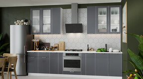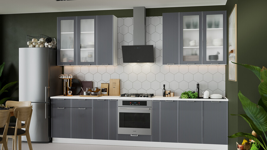 Кухня «Кимберли» — это утонченная и сияющая композиция, фасады которой напоминают выразительные «дорожки»-каннелюр, привнося частичку классики в современный образ. Вертикальная фрезеровка высокой частоты – эксклюзивная черта этой модели. Рельефные фасады задают ритм, последовательность и придают интерьеру особенность. При этом вертикальные полосы смотрятся гармонично и естественно. Кухня «Кимберли» создана для поклонников современного дизайна, это прекрасный выбор для тех, кто хочет придать своей кухне яркую индивидуальность. Цветовые исполнения этой кухни будут прекрасно сочетаться с любыми оттенками в оформлении интерьера и идеально подойдет как для маленьких, так и для просторных помещений. Матовые плёночные фасады. Имеют благородный внешний вид и приятны на ощупь. Фасады выполнены из МДФ 19 мм в матовой пленке ПВХ, с эффектной вертикальной фрезеровкой по всей поверхности, придающей кухне неповторимый вид. Изысканный дизайн элементов серии. Особый шик и узнаваемость кухне придают актуальные благородные декоры «Сноу», «Крем», «Муссон», «Титан» и вставки из стекла сатин 4 мм. Металлическая ручка, цвета «металл» удобна в использовании и полностью завершает композицию. Уменьшенная глубина каркасов. Каркасы в декоре «Белый» и «Дуб крафт золотой» выполнены из ЛДСП 16 мм. Новинка подойдет даже для малогабаритных кухонь, ведь глубина нижних каркасов 478 мм. Пластиковые ножки выглядят стильно и имеют регуляцию по высоте. Модульность. Коллекция содержит в себе широкий ряд элементов для основных нужд хозяек: верхние модули с глухими распашными фасадами, распашными фасадами со стеклом, нижние модули распашные, комбинированные, с ящиками под бытовую технику. Все это многообразие позволяет комплектовать гарнитур только из необходимых элементов исходя из индивидуальных потребностей. Дополнительные опции. Для завершения композиции и повышения уровня комфорта при эксплуатации дополнительно приобретаются: столешница, пластиковый цоколь, плинтус пристенный, стыковочные, угловые и торцевые планки для столешниц и стеновых панелей, посудосушители, которыми можно оснастить верхние модули, петли с доводчиками, для замены петель стандартной комплектации. | Каркас: ЛДСП 16 мм с кромкой ПВХ