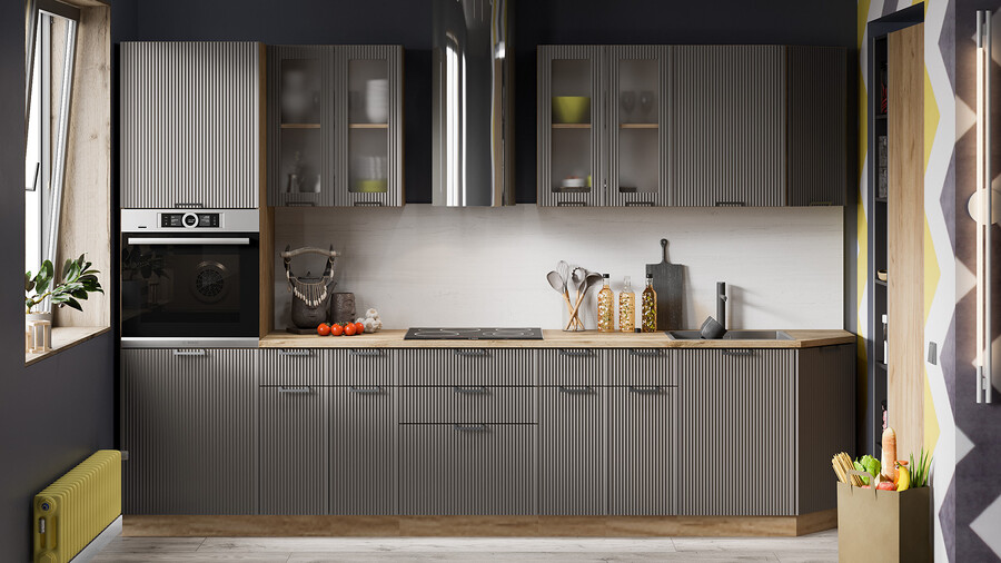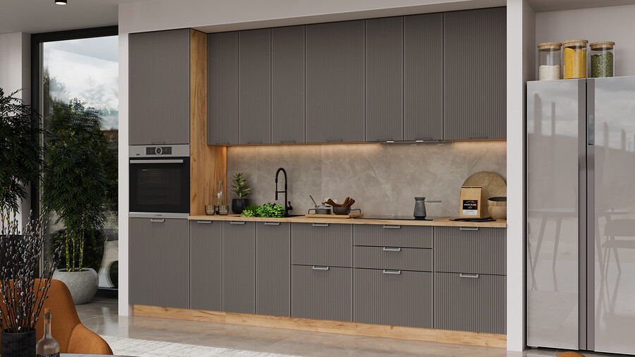 Кухня «Кимберли» — это утонченная и сияющая композиция, фасады которой напоминают выразительные «дорожки»-каннелюр, привнося частичку классики в современный образ. Вертикальная фрезеровка высокой частоты – эксклюзивная черта этой модели. Рельефные фасады задают ритм, последовательность и придают интерьеру особенность. При этом вертикальные полосы смотрятся гармонично и естественно. Кухня «Кимберли» создана для поклонников современного дизайна, это прекрасный выбор для тех, кто хочет придать своей кухне яркую индивидуальность. Цветовые исполнения этой кухни будут прекрасно сочетаться с любыми оттенками в оформлении интерьера и идеально подойдет как для маленьких, так и для просторных помещений. Матовые плёночные фасады. Имеют благородный внешний вид и приятны на ощупь. Фасады выполнены из МДФ 19 мм в матовой пленке ПВХ, с эффектной вертикальной фрезеровкой по всей поверхности, придающей кухне неповторимый вид. Изысканный дизайн элементов серии. Особый шик и узнаваемость кухне придают актуальные благородные декоры «Сноу», «Крем», «Муссон», «Титан» и вставки из стекла сатин 4 мм. Металлическая ручка, цвета «металл» удобна в использовании и полностью завершает композицию. Уменьшенная глубина каркасов. Каркасы в декоре «Белый» и «Дуб крафт золотой» выполнены из ЛДСП 16 мм. Новинка подойдет даже для малогабаритных кухонь, ведь глубина нижних каркасов 478 мм. Пластиковые ножки выглядят стильно и имеют регуляцию по высоте. Модульность. Коллекция содержит в себе широкий ряд элементов для основных нужд хозяек: верхние модули с глухими распашными фасадами, распашными фасадами со стеклом, нижние модули распашные, комбинированные, с ящиками под бытовую технику. Все это многообразие позволяет комплектовать гарнитур только из необходимых элементов исходя из индивидуальных потребностей. Дополнительные опции. Для завершения композиции и повышения уровня комфорта при эксплуатации дополнительно приобретаются: столешница, пластиковый цоколь, плинтус пристенный, стыковочные, угловые и торцевые планки для столешниц и стеновых панелей, посудосушители, которыми можно оснастить верхние модули, петли с доводчиками, для замены петель стандартной комплектации. | Каркас: ЛДСП 16 мм с кромкой ПВХ
