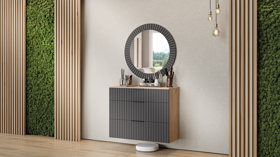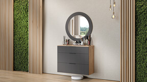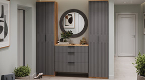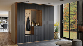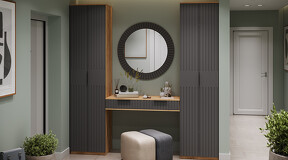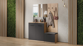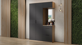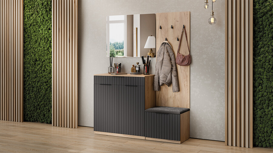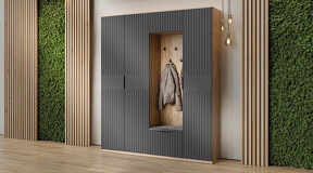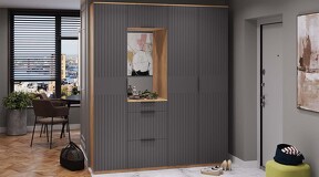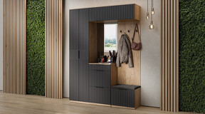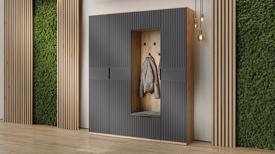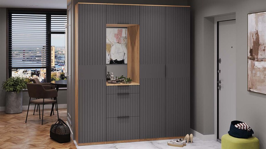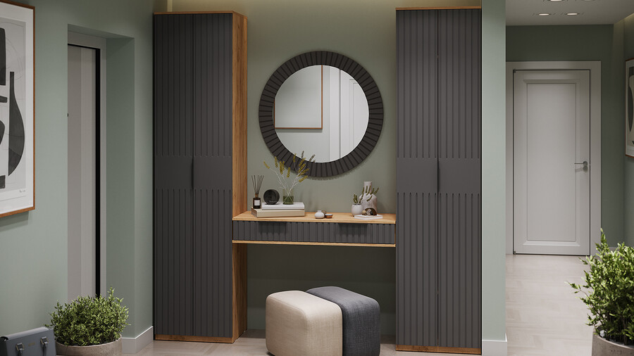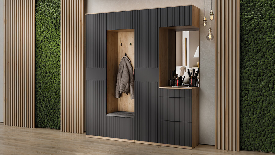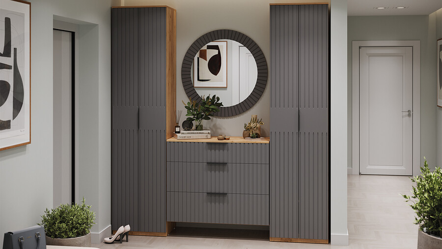 Коллекция мебели "Хилтон" предлагает современный дизайн и функциональность. Она станет прекрасным дополнением к вашему интерьеру и поможет создать стильную и организованную прихожую. Дизайн. Цветовая палитра мебели сочетается между собой и создает приятное визуальное впечатление. Благодаря тщательно подобранной цветовой палитре, мебель этой линейки следует модным трендам и актуальным стилям. Цвет металлических ручек подобран к оттенку фасадов, что помогает создать гармоничный и современный образ прихожей, который будет сочетаться с любым интерьером. Мягкое сидение из велюра сочетает в себе комфорт, стиль и практичность. Модульность. Прихожая состоит из модульной системы, включающей все необходимые элементы: удобные места хранения для одежды, обуви, головных уборов и других аксессуаров. Вы можете комбинировать модули прихожей в различных вариантах в соответствии с вашими потребностями и предпочтениями. Функциональность. Модули прихожей изготовлены из высококачественных материалов и имеют современный дизайн, обеспечивающий удобство использования и практичность. Они могут быть выстроены в функциональные композиции, подходящие для организации вашего пространства. Коллекция мебели «Хилтон» идеально подойдет для прихожих различных размеров и поможет эффективно организовать пространство. | Каркас: ЛДСП 16мм Фасад: МДФ, пленка ПВХ Кромка: ПВХ 0,4мм Направляющие: Шариковые Петли: Без доводчиков (можно заменить на петли с доводчиком накладные) Ручка: Металлическая , торцевая Зеркало: 4мм Мягкий элемент: Велюр Wellmart Graphite, Велюр Jercy Chocolad Коллекция: Wellmart Graphite, Jercy Chocolad |