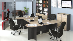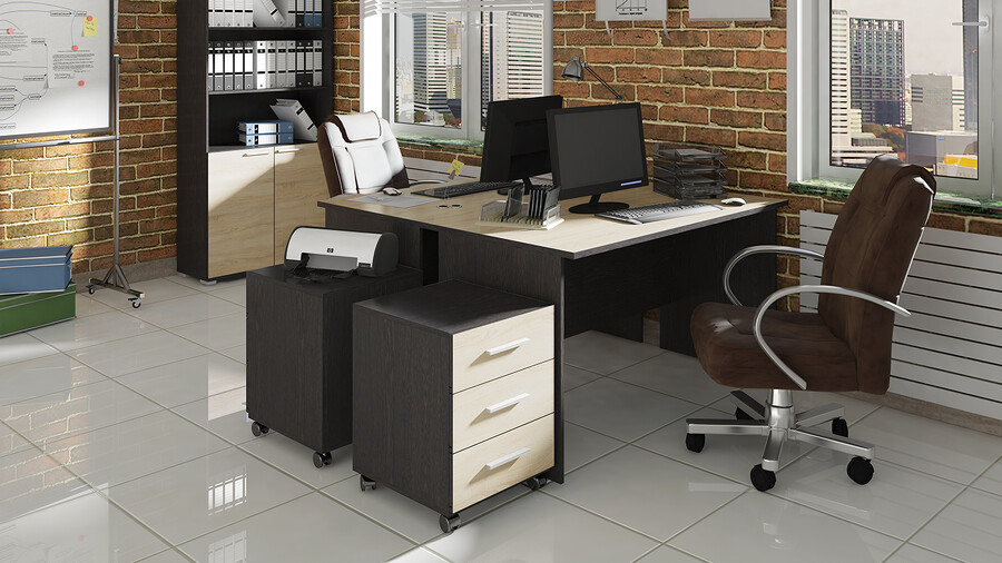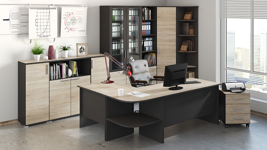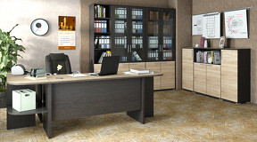 Мебель для офиса «Успех-2» - это классический выбор для офисного пространства. Она отлично подойдет для организации любого рабочего места: как для сотрудников, так и для кабинетов руководителей. Дизайн. Коллекция мебели изготовлена из надежных материалов, что обеспечивает не только красоту, но и долговечность. Каркас и фасад выполнен из ЛДСП, а стеклянные двери с профилем МДФ в цвет фасада гармонично сочетаются между собой. Модульность. Мебель для офиса обладает широким выбором модулей, что позволяет создавать различные композиции и сочетания, в зависимости от ваших предпочтений и потребностей. Наш ассортимент включает в себя шкафы для одежды и документов, которые помогут поддерживать порядок и эстетичный вид в помещении. Разнообразие столов разной длины и тумб с ящиками, которые позволят подобрать оптимальное решение для каждого рабочего места, ведь в них легко разместятся мелкие предметы, аксессуары и другие необходимые вещи, оставляя рабочий стол свободным и аккуратным. | Каркас/фасад: ЛДСП 16мм Кромка: ПВХ 0,4мм,2мм Ручка: Металлическая Стекло: Бронза Крышка столов: ЛДСП 22мм, кромка 2мм |