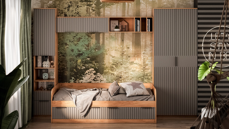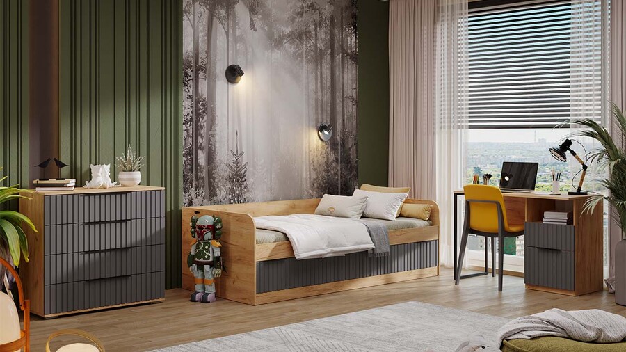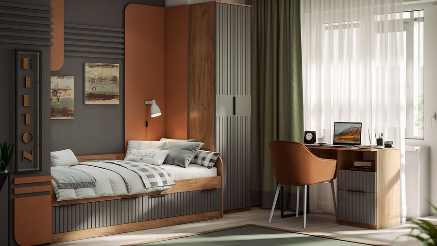 Коллекция мебели «Хилтон» отличается минималистичным дизайном, который подойдет для любого помещения - будь то детская комната, кабинет или прихожая. Наша новинка станет отличным решением для тех, кто ценит комфорт и функциональность в своем доме. Дизайн. Коллекция мебели выполнена из качественных материалов и имеет современный дизайн, который легко сочетается с любым интерьером. Благодаря тщательно подобранной цветовой палитре, мебель этой линейки следует модным трендам и актуальным стилям. Цвет металлических ручек подобран к оттенку фасадов, что завершает концепт коллекции и создает идеальный баланс стиля и качества. Модульность. Детская коллекция мебели «Хилтон» представляет собой модульную систему, включающую все необходимые элементы: удобную кровать со спальным местом 900х2000, просторный письменный стол, навесные шкафы и полки для книг, шкафы для одежды, белья и хранения различных предметов. Вы можете самостоятельно подобрать нужные модули и создать идеальную композицию, адаптированную к размерам и особенностям детской комнаты в соответствии с вашими потребностями и предпочтениями. Функциональность. Детская коллекция мебели «Хилтон» обладает высокой функциональностью, предоставляя все необходимые элементы для эффективной организации пространства в едином стиле. А если Вам приглянулась коллекция мебели «Хилтон», то из представленных модулей можно собрать не только набор для детской комнаты, но и для кабинета. | Каркас: ЛДСП 16мм Фасад: МДФ, пленка ПВХ Обработка торцов: Кромка ПВХ 0,4мм Обработка торцов (крышка стола): Кромка ПВХ 2мм Направляющие: Шариковые Петли: Без доводчиков (можно заменить на петли с доводчиком накладные) Ручка: Металлическая, торцевая Зеркало: 4мм |