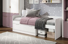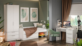 Коллекция «Марли», где за основу выбран минимализм, одинаково хорошо будет выглядеть как в детской комнате, так и кабинете, а если собрать композицию с уже имеющимися модулями малых форм, то можно оформить даже прихожую Дизайн. Белый – цвет чистоты и новой страницы в жизни. Это уникальный цвет и он не привязан ни к одному из стилевых направлений в дизайне. Торцевые металлические ручки окрашены белой матовой краской и завершают единый образ коллекции. Модульность. Модули коллекции «Марли» оснащены всем необходимым: от удобного спального и рабочего места до шкафов для одежды, книг и места для хранения необходимых предметов. Все модули серии идеально комбинируются между собой и выстраиваются в функциональные композиции, подходящие для оформления разных комнат в едином стиле. Остается определиться с оттенками для стен, пола и текстиля и наслаждаться каждым отдельно взятым вариантом композиции. Функциональность. Шкафная группа коллекции оснащена полноценными выдвижными ящиками, а шариковые направляющие позволяют плавно и бесшумно их эксплуатировать. Шкаф для одежды дополнен двумя металлическими штангами и секцией с полками, что максимально увеличивает место для хранения вещей. Нестандартный вариант стеллажа с распашной дверцей прекрасно впишется в общую композицию и поможет разместить книги или необходимые предметы декора. | Каркас/Фасад: ЛДСП 16мм Обработка торцов: Кромка ПВХ 0,4мм Обработка торцов (крышка стола/видимые торцы кровати): Кромка ПВХ 2мм Ручка: металлическая торцевая, цвет белый матовый Направляющие: шариковые Петли: без доводчиков (можно заменить на петли с доводчиком вкладные) Максимальная нагрузка на спальное место:100 кг Максимальная нагрузка на ящик кровати: 15кг Максимальная нагрузка на крышку комода и тумбы: 15 кг Максимальная нагрузка на ящик комода: 10кг Максимальная нагрузка на крышку стола: 15кг Максимальная нагрузка на ящик стола: 3кг Максимальная нагрузка на полки шкафов, стеллажа: 5-10кг Максимальная нагрузка на ящики шкафов: 5кг