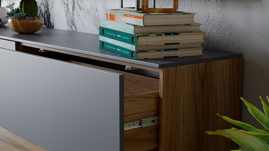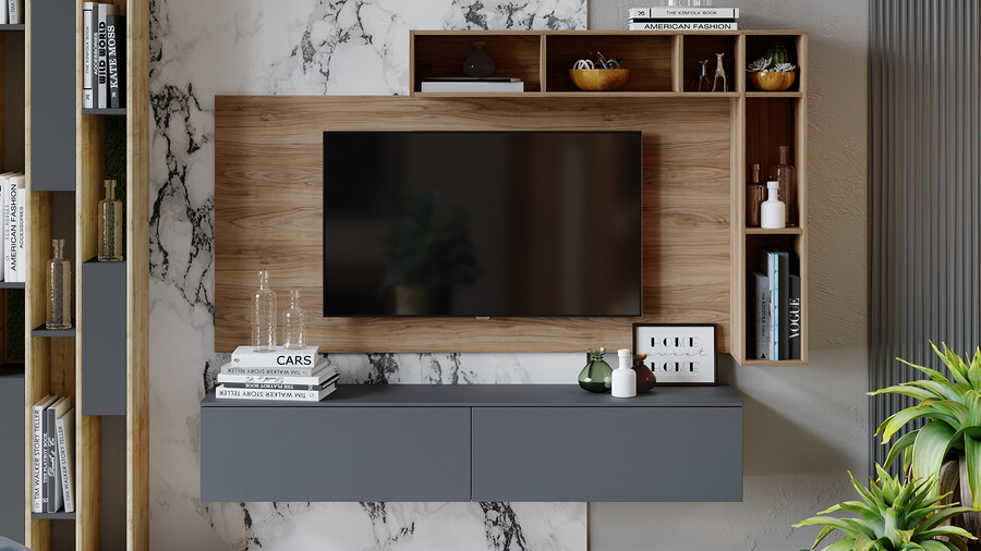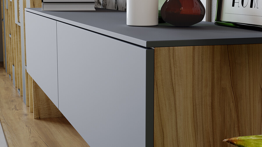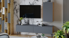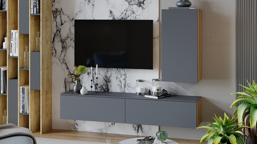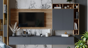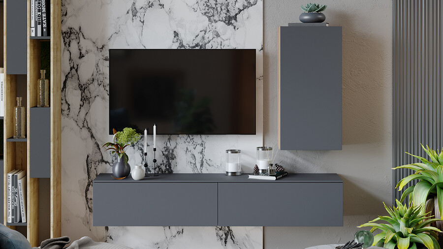 Декор. В дизайне коллекции нашли отражение самые актуальные тренды: изысканный минимализм формы, сочетание цвета и текстур, покрытие фасадов с эффектом Soft-touch, которое представляет собой безбликовый материал, придающий фасадам глубокую матовость. Новинка состоит из отдельных модулей, что даёт возможность воплотить свои творческие идеи и стать соавтором в дизайне неповторимого интерьера. Универсальность. В наборе мебели для гостиной «Порто» всего три модуля- тумба под ТВ 900,1800 и Шкаф навесной. Декоративная панель под ТВ и навесной стеллаж являются универсальными модулями, которые подойдут как к коллекции «Порто», так и к коллекции «Глосс». Именно этот вариант дает возможность для воплощения различных идей расположения модулей в интерьере. Модульность. Тумба под ТВ имеет вместительные ящики для хранения, а шариковые направляющие позволят плавно и бесшумно открывать их и закрывать. В конструкции ТВ тумбы использована комбинированная система открывания, где установлена система push-to-open и имеется возможность открывания с помощью захвата рукой снизу. Шкаф навесной также открывается с помощью захвата рукой снизу. Панель для ТВ, стеллаж навесной и металлические опоры являются универсальными модулями, которыми, при необходимости, можно дополнить композицию. | Каркас: ЛДСП 16мм Фасад: МДФ в пленке ПВХ Обработка торцов: кромка ПВХ 0,4 мм ДВП: в цвет фасадов Направляющие: Шариковые Открывание : -шкаф навесной (захватом снизу) - тумба ТВ (захватом/push-to-open) *крепление к стене в комплекте |