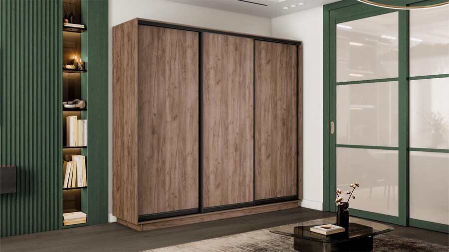 Шкаф-купе «Румер-2» удивит Вас своей функциональностью. Множество вариантов комбинации модуля дают Вам возможность воплотить любые идеи оформления и выбрать наполнение, исходя из своих потребностей. Дизайн. У модели большое количество вариаций дизайна, которые открывают большое поле для воплощения в жизнь разного рода идей. К каркасу шкафа можно выбрать разные варианты фасадов из ЛДСП и зеркала, что позволит Вам создать идеальное сочетание, которое подчеркнет стиль вашего интерьера. Конструктив. Грамотный конструктив шкафов – купе «Румер-2» разной ширины позволяет практично организовать пространство в комнате, обеспечив при этом удобство и комфорт. Лицевая фурнитура – трапециевидная профильная ручка. Внутренне наполнение. Полки и горизонты расположены без смещения по высоте между левой и правой секцией (полки параллельны по высоте). Это обеспечивает общую симметрию внутри шкафа. Универсальная сборка позволяет менять расположение штанги и полок в секциях шкафа. | Каркас/ Фасад: