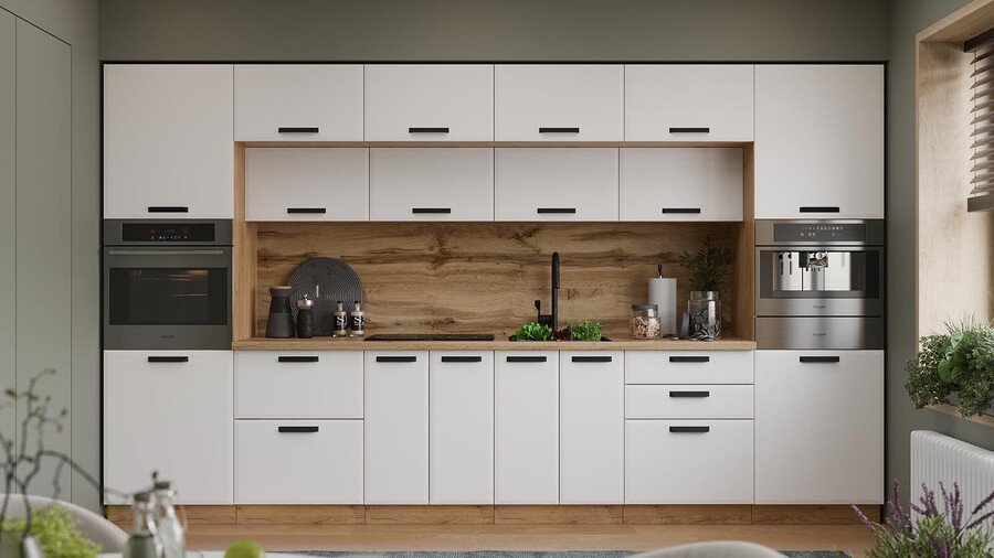 В стоимость не включеноСтеновая панель, столешница, доводчики, бытовая техника, мойка, смеситель, аксессуары