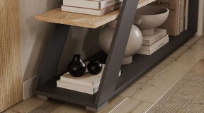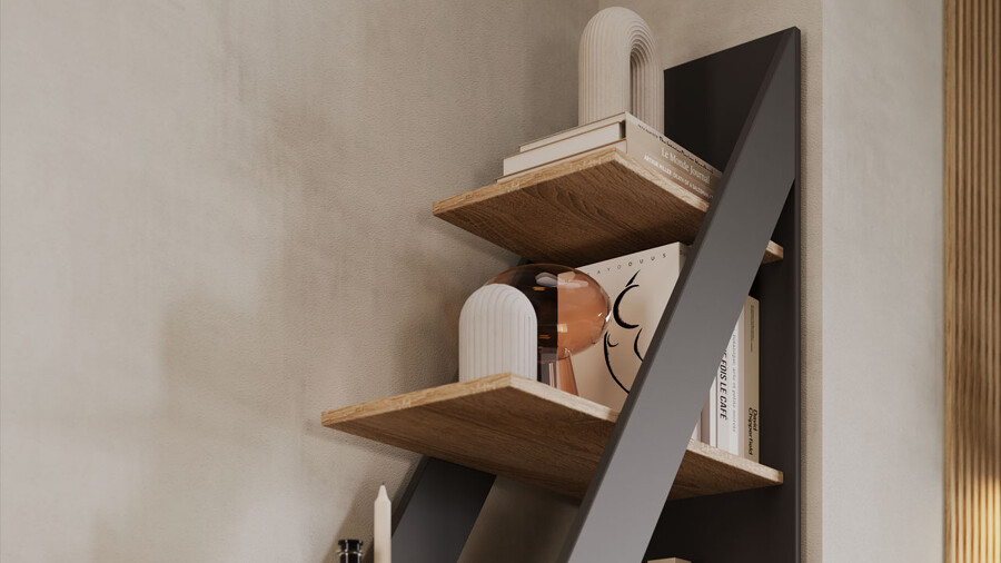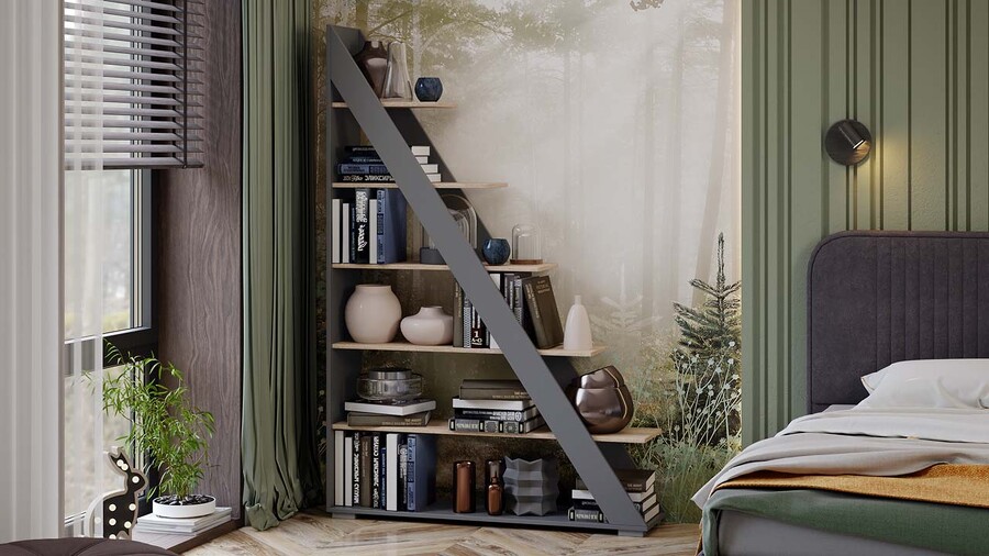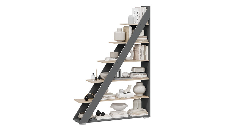 Стеллаж тип 14 представляет собой ассиметричную горку, способную стильно дополнить интерьер комнаты практически в любом стилистическом направлении. Дизайн. Новое оформление сочетает контрастные текстуры «Дуб сонома» и «Графит серый», благодаря чему стеллаж уверенно становится самостоятельной частью интерьера. Такое решение понравится тем, кто стремится подчеркнуть индивидуальность своего жилища и рационально использовать свободное пространство. Главное достоинство стеллажа - удачное сочетание угловых и прямых линий, создающих оригинальный и выразительный визуальный эффект. Функциональность. Стеллаж тип 14 способен полностью заменить собой вместительный книжный шкаф, секцию модульной мебельной стенки или стать декоративной перегородкой в Вашей комнате. Он обеспечивает удобную организацию хранения книг, журналов, аксессуаров и других предметов, сохраняя при этом гармоничный внешний вид. | Каркас/Фасад: ЛДСП 16 мм